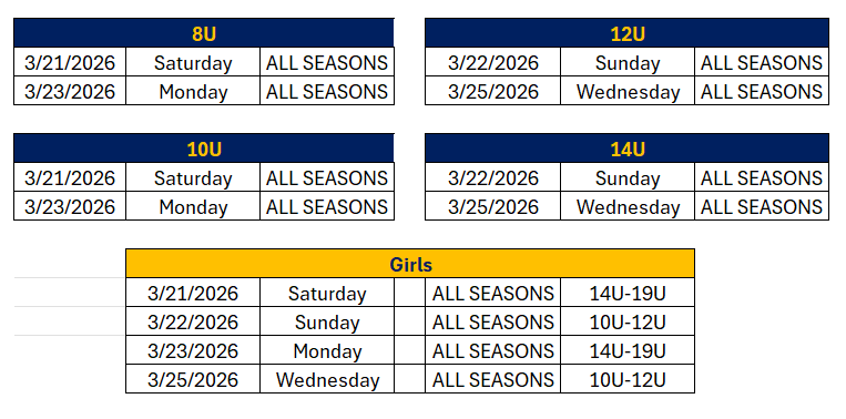 Gold & Navy teams' primary focus will be tournament play on select weekends, utilizing their home weekend slots for internal 3v3, 4v4 and 5v5 competition.