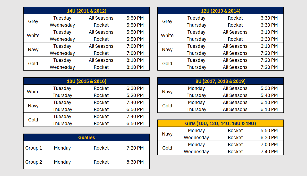Following evaluations, players will be placed in a training group (White, Navy, Gold) based on both age and ability. The intention is to make sure every player is within their proper competitive window to get the most out of their own personal development. Group requests will not be taken into consideration.