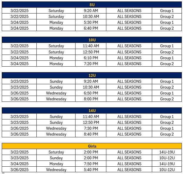 Evaluation groups will be built by both age and ability to make sure every player is within their competitive window for the most efficient manner to properly evaluate every player. Group requests will not be taken into consideration.